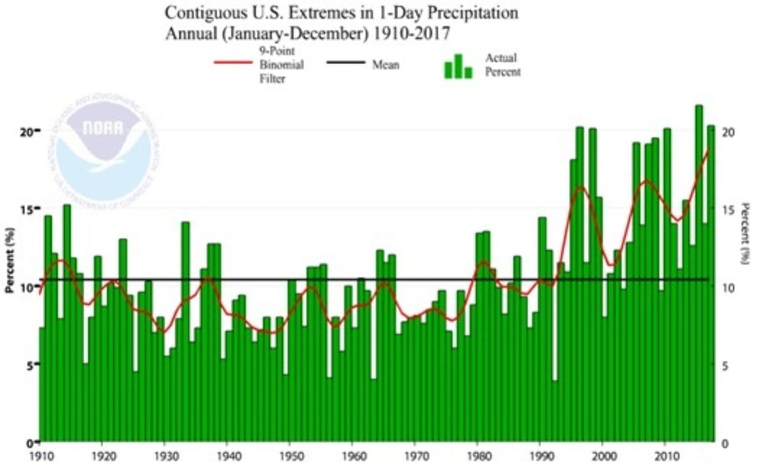 The U.S. Climate Extreme Index quantifies the observed changes in one-day precipitation extremes across the U.S. Since 1990, there has been an increase in the area of the U.S. that has experienced a one-day extreme rainfall.