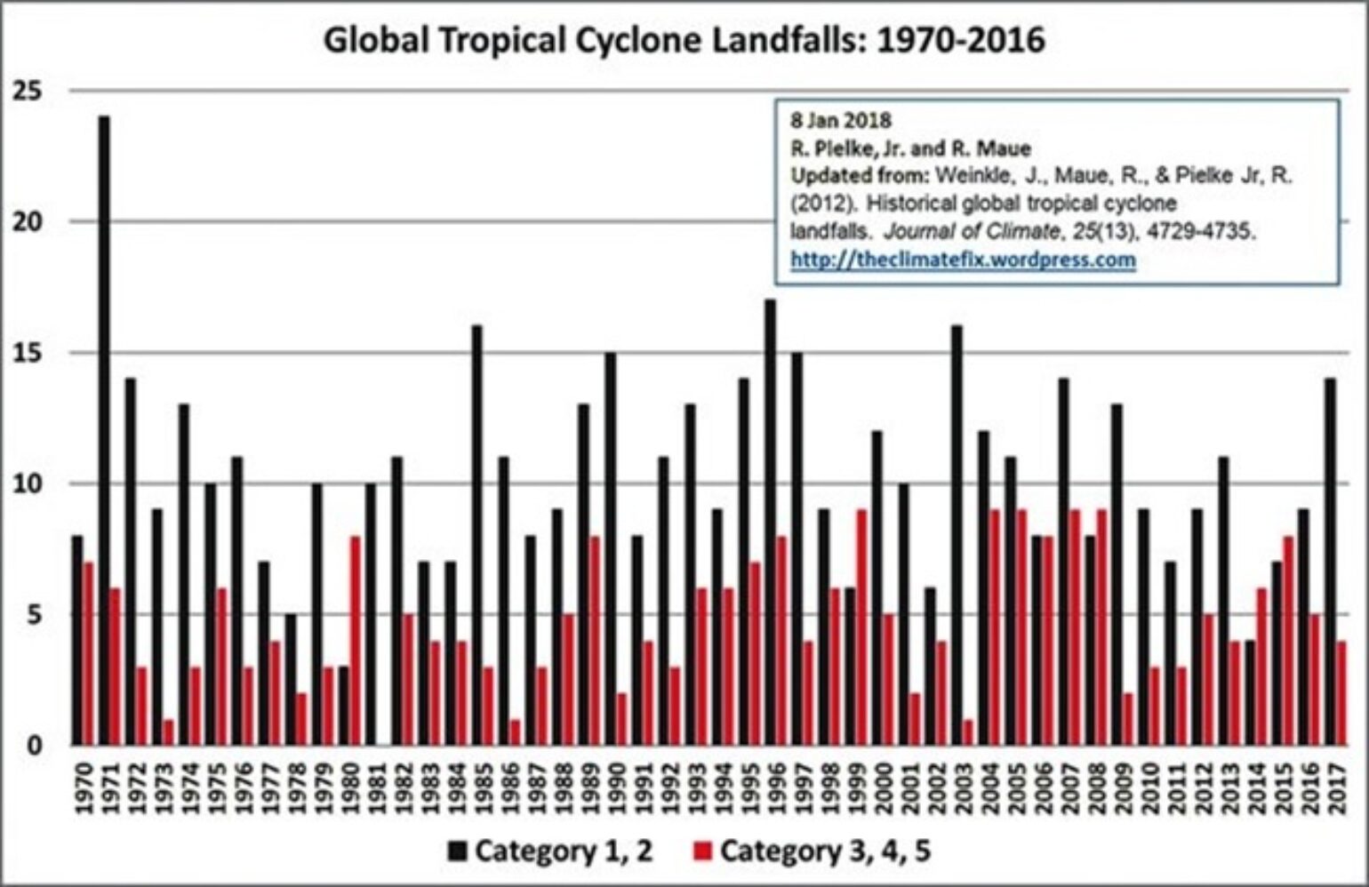 2017 had 18 total landfalling named storms. 14 of these had a category 1 or 2 and four of the three major categories were in North America. As for severe weather, poor data quality makes conclusions about long-term trends problematic. Observed trends in small spatial-scale phenomena such as tornadoes and hail can be made with only low confidence levels, but more recently the data is suggesting clearly a downward trend in the number of occurrences of major tornadoes.