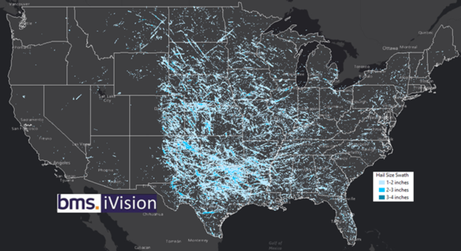 The figures above show tornadoes, hail, and wind-based on local storm reports counted with preliminary data for 2023. The data shows tornadoes are a bit above the recent average, and hail is below. Winds, in contrast, were exceptionally high in 2023 compared to the last several years. So maybe the losses in 2023 have more to do with wind-driven losses in combination with wind-driven hail driving up losses. The drivers could also be on where the severe weather was occurring. Below is a BMS iVision and our aggregate Verisk Respond data highlighting some troubled areas for hail over 1 inch and wind gusts over 60 mph.