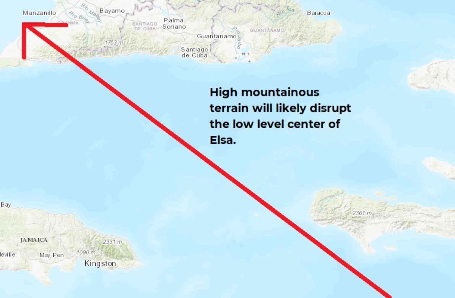 After rapidly intensifying into a hurricane yesterday morning Elsa is struggling with low-level wind shear as its low-level center is displaced about 90 miles northwest of any organized convection. This is not a sign of a healthy hurricane and was downgraded this morning. This disorganization also means the low-level center could be completely disrupted by the very high topography of Haiti and Cuba, which have mountainous terrain up 7,700 feet above sea level.