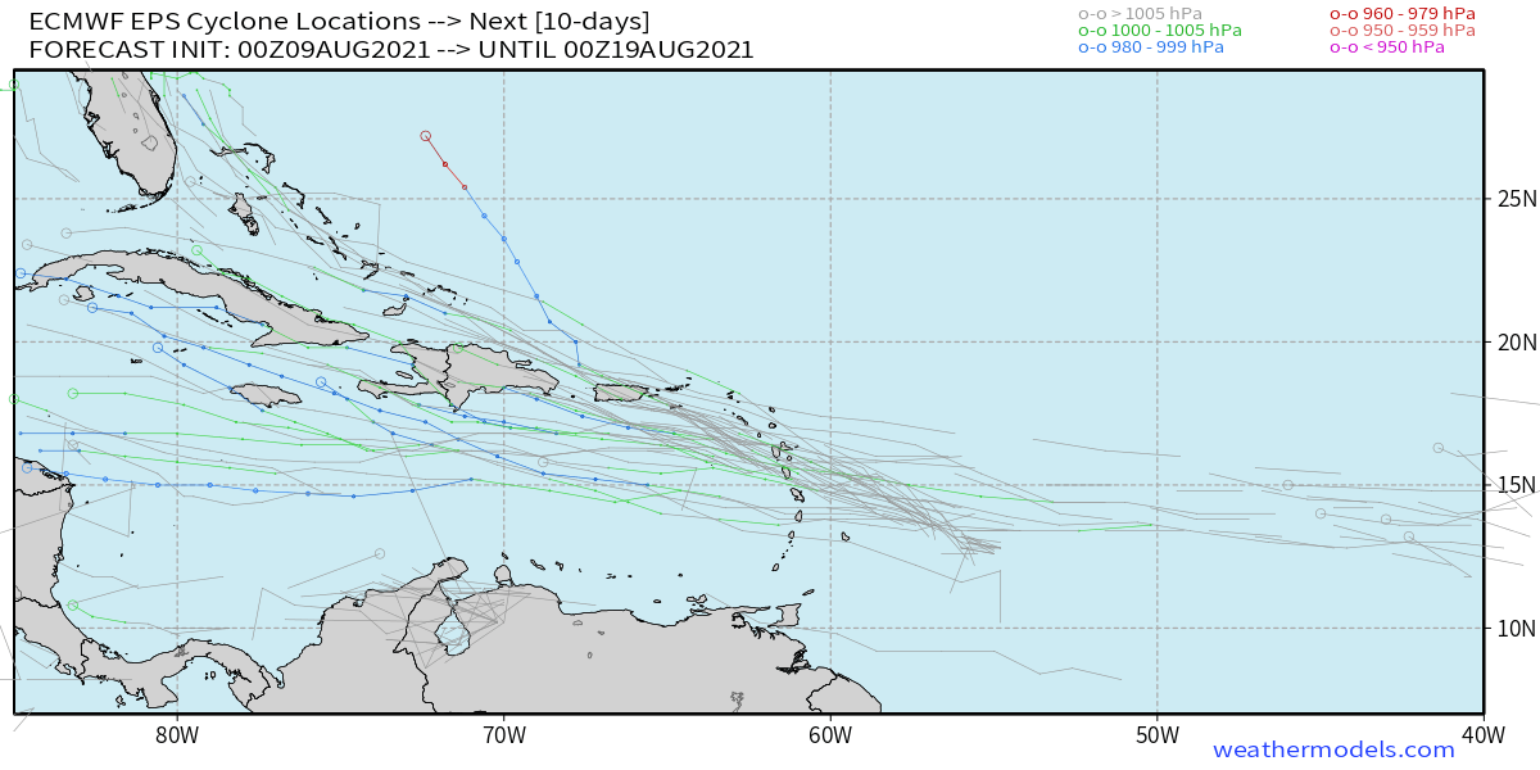 Regardless of whatever happens in the Caribbean over the next few days, some sort of convection should be near Florida or the Bahamas by the later part of this week. The ECMWF ensembles, which offer up 51 different forecasts, show confidence in a fully-developed tropical cyclone is low. There is likely a higher chance of a named storm in the Caribbean than near Florida later this week due to all the hurdles as discussed above. Only 11 of 51 ECMWF ensemble members depict a closed cyclone five days from now and only 1 of 51 members depicts a tropical cyclone of any intensity as a hurricane or strong tropical storm. At this point, the system will face plenty of hurdles.