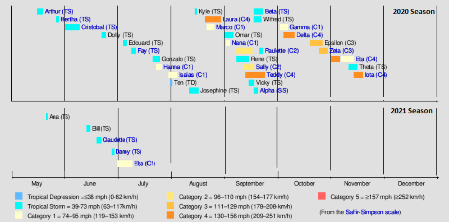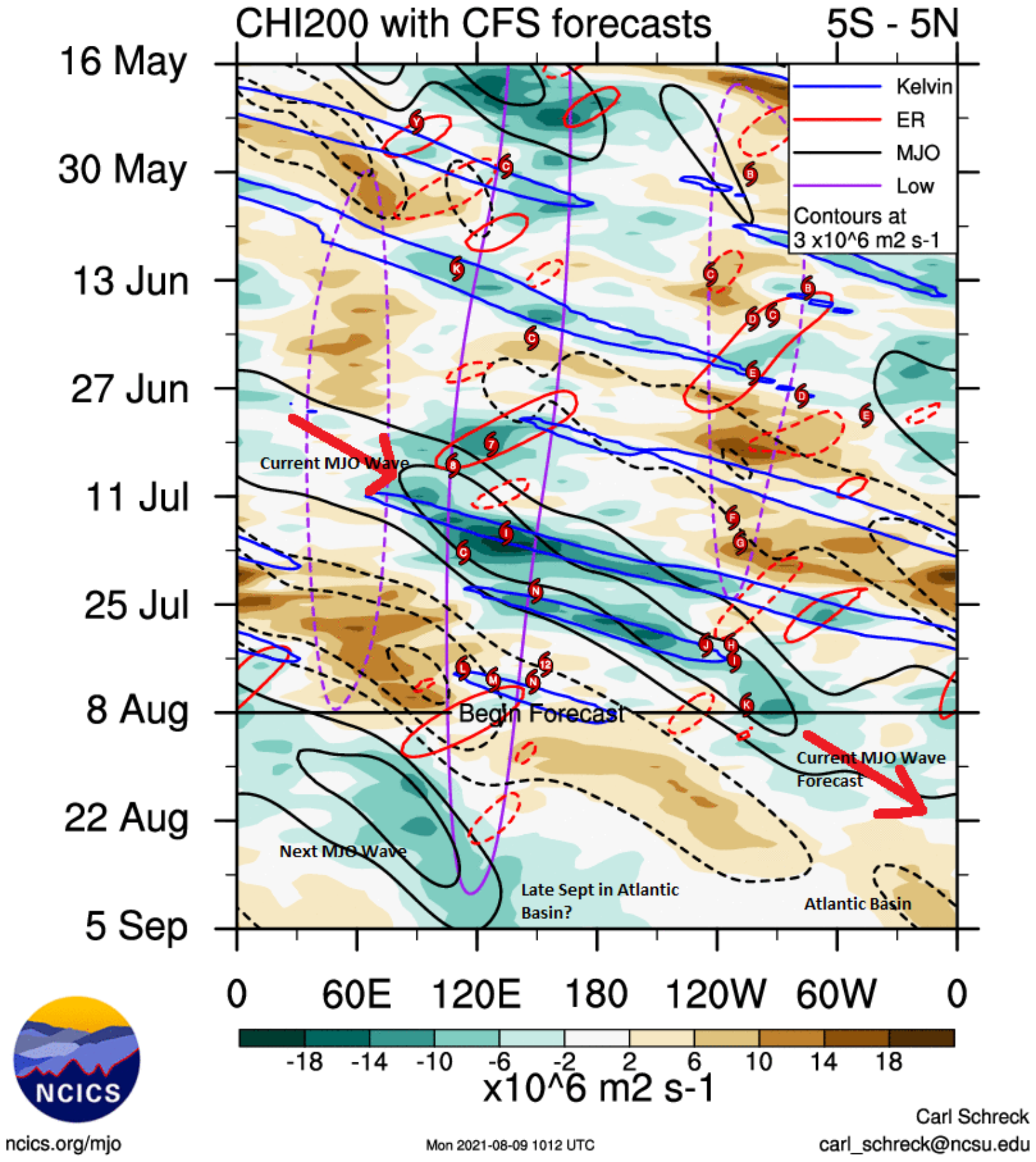 This very quiet period is in stark contrast to the active 2020 Atlantic hurricane season. By this time last year, we were watching for the formation of tropical storm Josephine, while this year we are still waiting for Fred which will be the next name to be used in the tropical Atlantic basin. So far this season there have been 5 named storms over 13.75 named storm days, which is above average based on year-to-date climatology. However, hurricanes and hurricane days are slightly below average. But these numbers tend to be fairly low before the middle part of August when the Atlantic basin activity starts to build climatologically more hurricanes and major hurricanes.