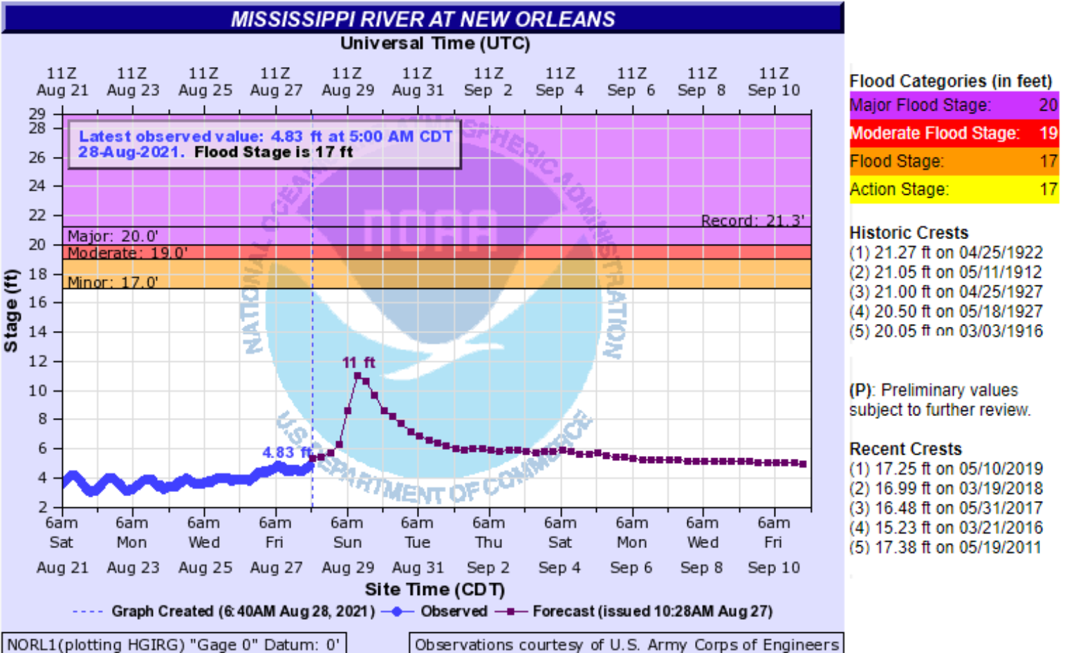 Ida is not forecasted to stall and should be moving fairly rapidly at landfall. This will limit the inland flooding impacts. However, many parts of Southeast Louisiana have already seen 70 inches or more of rain year to date, including parts of New Orleans and Baton Rouge that are very prone to flooding. Another 8"-15" could fall through Monday. However, a bit of good news that has not been discussed is how low the Mississippi River is due to a dry summer over much of the Central Plains and Upper Midwest. This will not only help mitigate the impacts of flooding rains, but any storm surge that pushes up the river will have more room due to lower river levels. Below is the river gauge of the Mississippi River at New Orleans. This shows the low water level and the forecasted rise of 11 feet is well below any record water height. Although this is a bit of good news, local flooding in a low-lying area is already common in Southeast Louisiana. Therefore, major rain-induced flooding should still be expected in many areas.