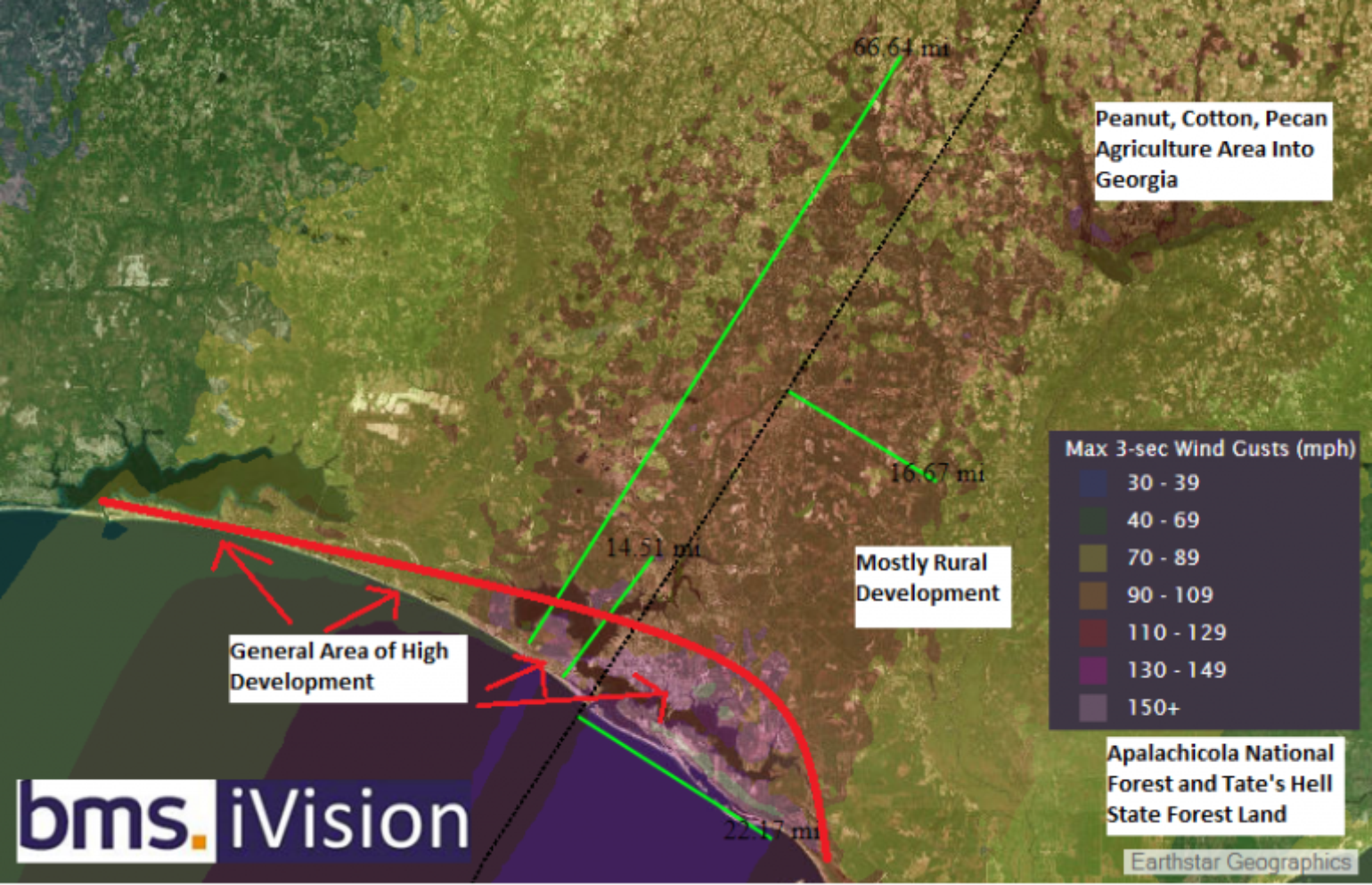 Here we take the details of the iVision wind swath with the aerial imagery applied to the base map. The radius of maximum winds is forecasted to be about 22 miles at landfall. The strongest winds are forecasted to impact the first 14 miles of coastal exposure as indicated by the first short green line, with the red line indicating areas of higher development. Most of the strongest winds will be over Forest or Agriculture land. Click on image for more detail.[/caption]The building codes inland are not as strong as in the coastal areas, such as Panama City, Fl. The older age of the homes inland, coupled with the potential for tree fall, make for uncertain loss estimates. Hurricane Irma illustrated that there are clearly loss creep issues occurring across the state, which will also add to the overall uncertainty around potential losses to the insurance industry. An early look at some of the catastrophe model guidance suggests a mid to high single-digit billion dollar loss event, but the impacts to Panama City need to be watched closely.