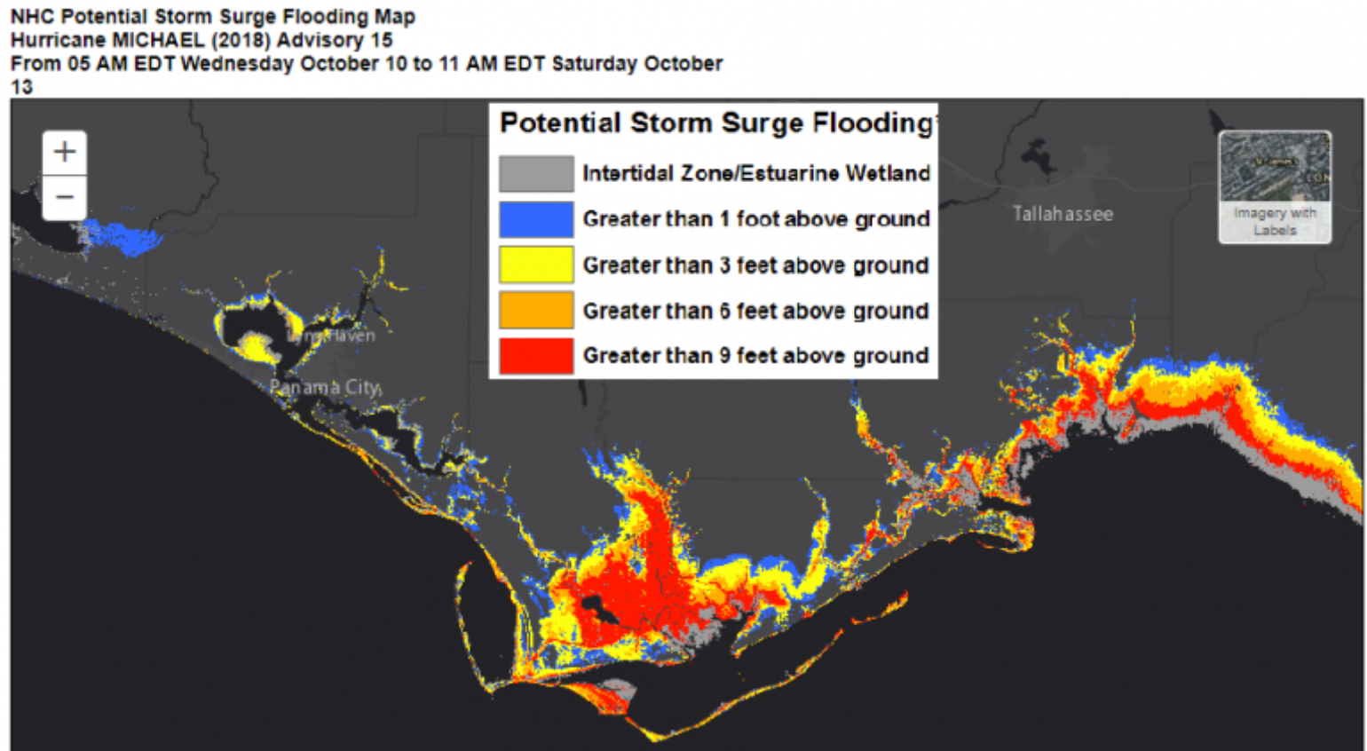 There is no doubt that record storm surge will be recorded, as storm surge values of four feet are already showing up in Apalachicola, FL. The next high tide will be just after 6:00 p.m., which should be a few hours after landfall, so, fortunately, Michael is not coming ashore during high tide.The NHC is suggesting the following storm surge levels: