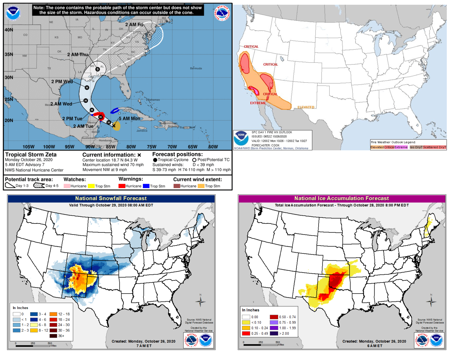 And of course, why not add a new hurricane into the weather pattern as the final month of the hurricane season approaches. While Hurricane Epsilon has tracked up past Newfoundland, Canada towards Iceland over the weekend, tropical troubles have been trying to get organized in the western Caribbean for the last week. This area is typically where tropical troubles would form this late in the season, so it should be no surprise that over the weekend Zeta has developed into a healthy tropical storm currently 175 miles southeast of Cozumel, Mexico. This is very similar to where Hurricane Delta ramped up to a Category 4 hurricane just a few weeks ago. The water in this area of the Caribbean is still very warm, and the wind shear is low providing the perfect conditions for named storm formation.
