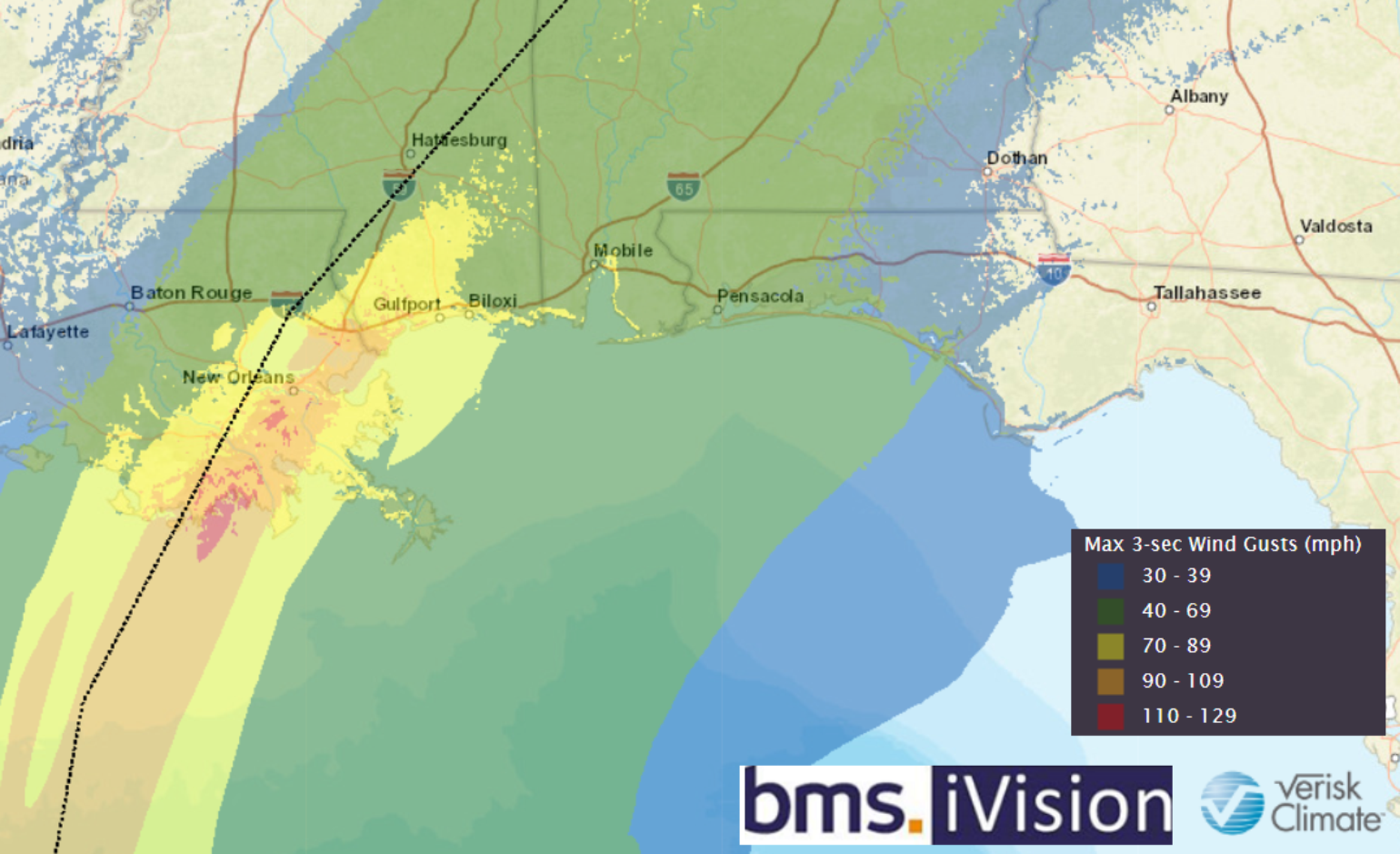 Zeta is forecasted to make landfall near New Orleans, which has not had a direct hit by a hurricane since Florence 1988, a Category 1 at landfall. Florence's angle at landfall does not match the angle at which Zeta will be making landfall. What might be a better fit is the hurricane of 1948 that hit the city in early September as a Category 1 hurricane. Below is the BMS iVision Verisk Respond 3-second wind gust product, which shows the magnitude of winds over the populated metro area of New Orleans. Therefore the critical aspect in the forecast is the track. If Zeta tracks any more west, that could put even more exposure in the general New Orleans area at risk of high winds. If the storm tracks further east, it will put less exposure at risk. We also cannot discount Gulfport and Biloxi's impacts, which will see strong hurricane-force wind gusts as Zeta makes landfall later tomorrow afternoon.