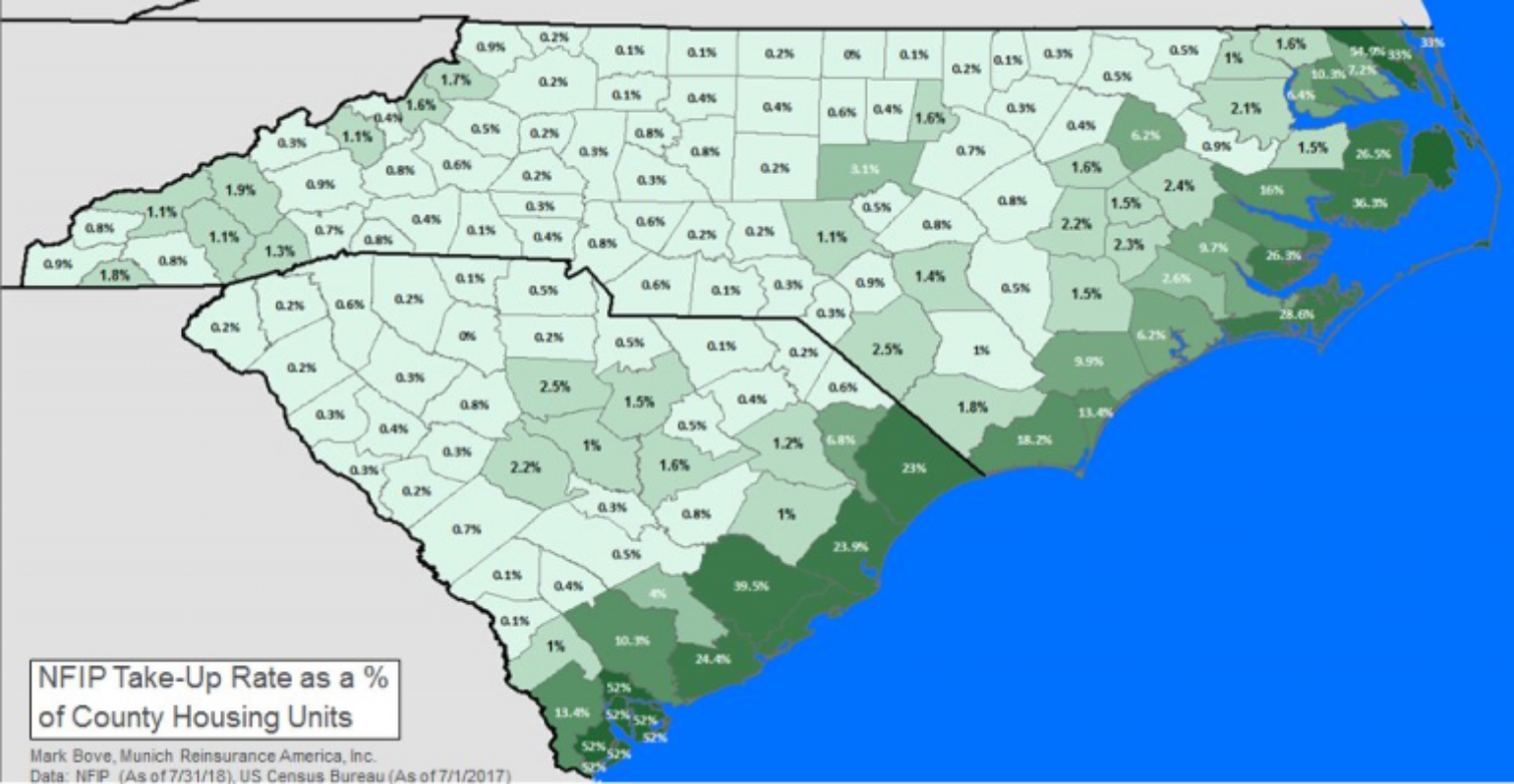 The National Flood Insurance Plan (NFIP) Take-Up Rate in the Carolinas as a percentage of county housing units is less than 1% for many inland counties, with much of the NFIP risk located at the coastal counties. Even the take-up rates in the highest storm surge impact counties of New Hanover, Pender and Onslow counties is relatively low , illustrating the large protection gap that exists across the Carolinas.