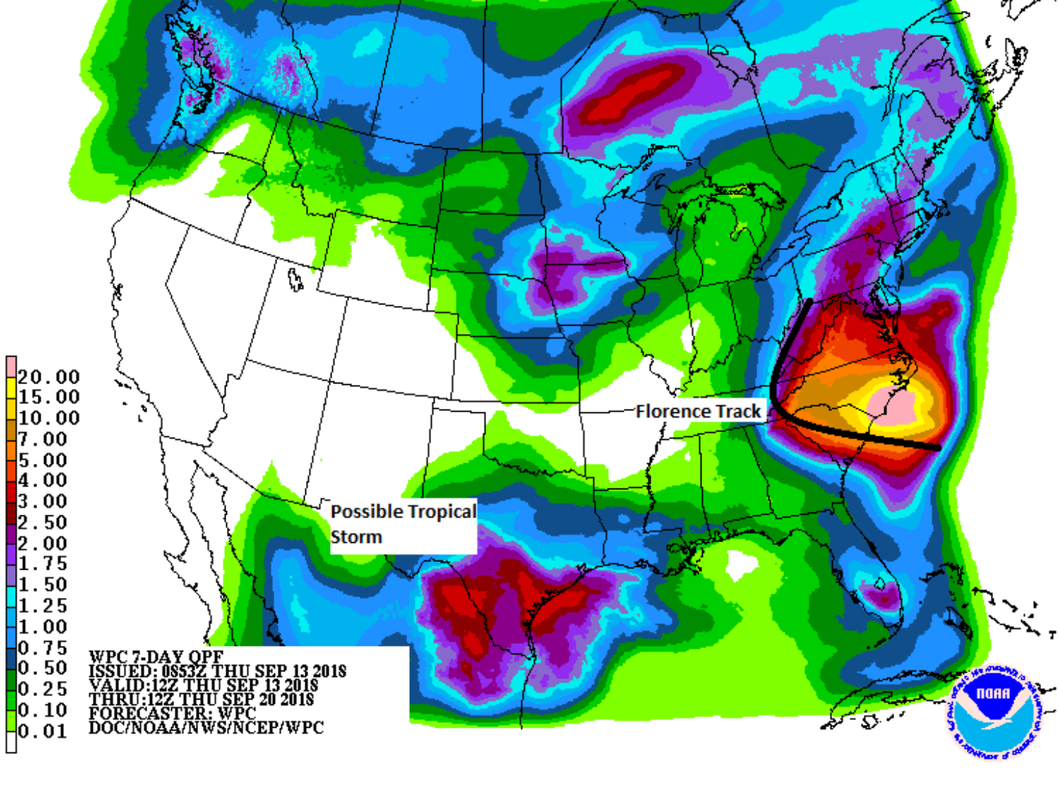 After tracking over 3,292 miles across the Atlantic Ocean, Florence will become one of only two hurricanes to make U.S. landfall from its origination point off the coast of Africa since 1851. It also becomes the only hurricane since 1851 to make landfall from its location that was observed in the middle of the Atlantic Ocean back on September 6th. For the last 2-3 days, the landfall target has been focused on an area between Myrtle Beach, NC and Morehead City, NC, with the primary area of impact being just north of Wilmington, NC in New Hanover, Pender and Onslow counties.