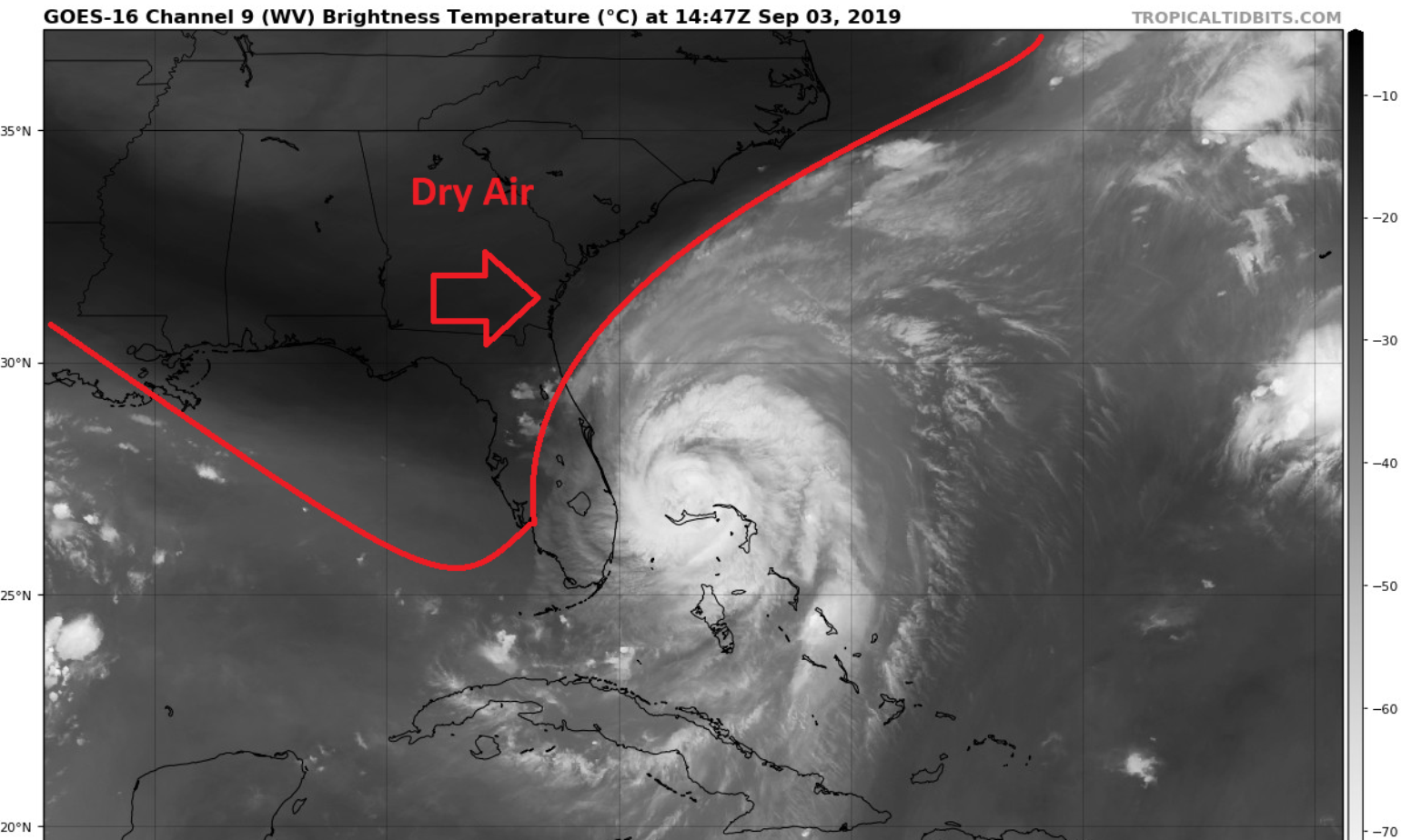 The water vapor satellite image below shows the trough starting to enter the Florida panhandle that will finally lift Dorian off the Bahamas. The trough contains shear and dry air that will aid in weakening the storm further as time progresses. However, Dorian is still a Category 2 hurricane so a lot of weakening must occur for it to become a minimal event to the Carolinas.
