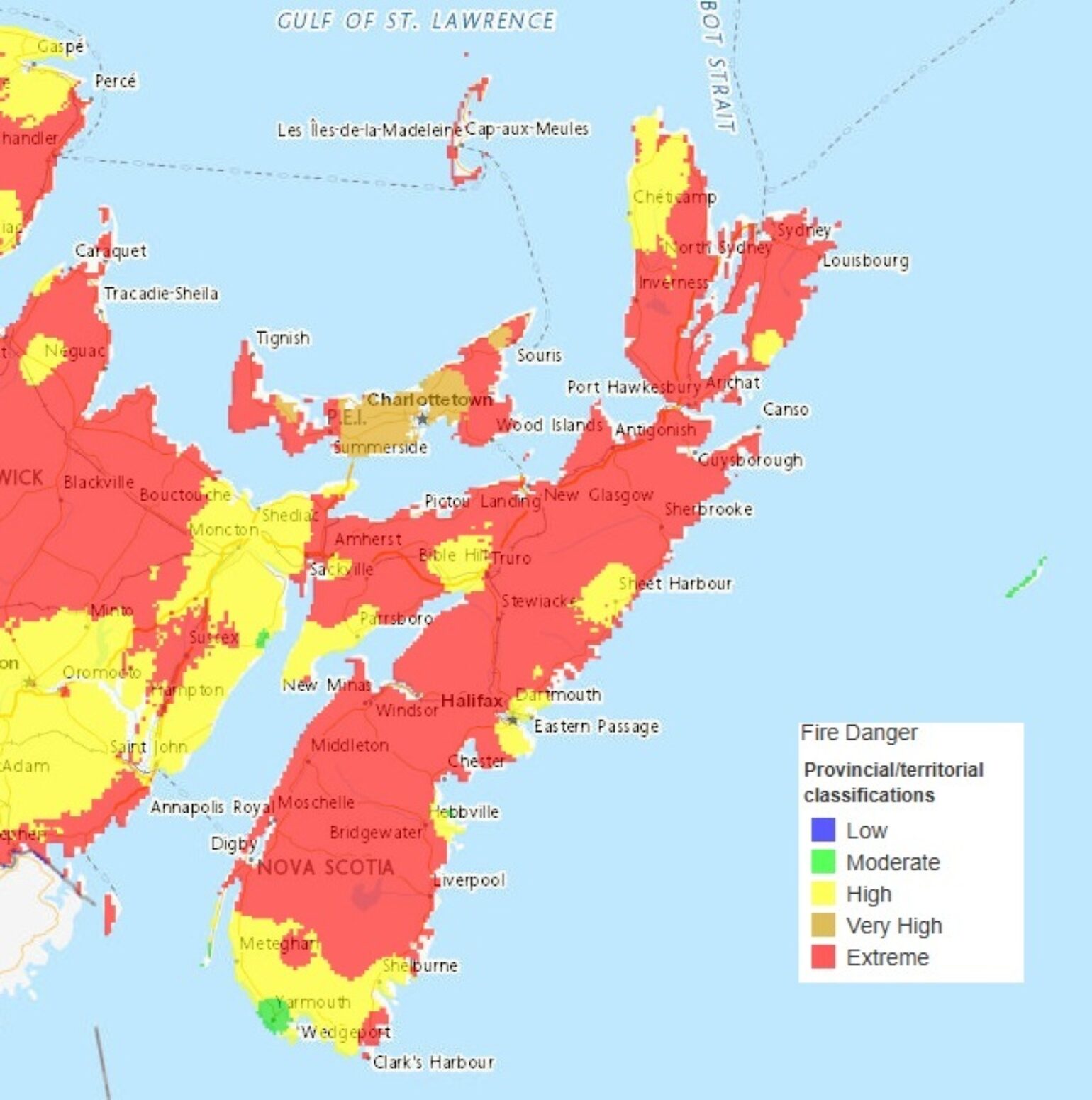 - Dry Fuels – Atlantic Canada has faced unusually dry conditions this year, with below-average rainfall and above-average temperatures in recent weeks. Grass, shrubs and forest litter are all at critical dryness levels, meaning they can ignite and spread flames quickly. Below is a look at the current wildfire danger across Atlantic Canada, with parts of Nova Scotia having High to Extreme wildfire risk from August 12th.
