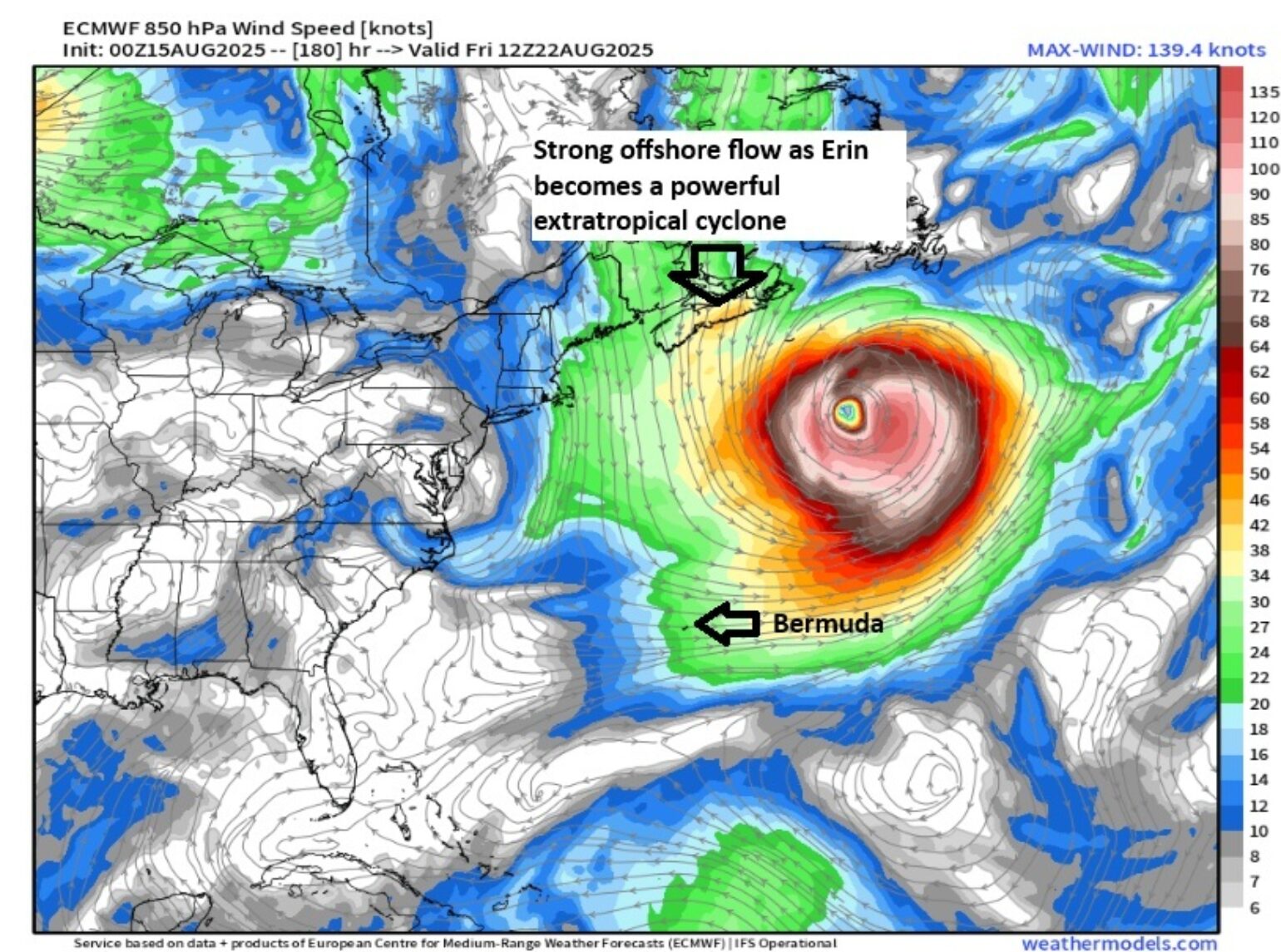 Below is the current forecasted wind field from the ECMWF model, showing that as Erin passes Nova Scotia, strong offshore winds could reach 50 knots or about 60 mph, enough to accelerate a fast-moving wildfire.
