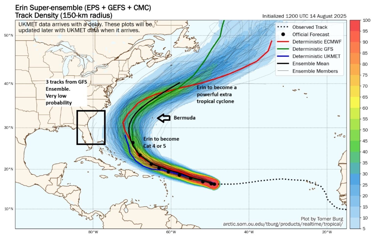 Erin will be tracking over some of the warmest water in the Atlantic basin, which is 30 °C or 86°F. Warm water is fuel for hurricanes, and it was suggested that Erin could become a category 4 hurricane, which the National Hurricane Center is now forecasting. One of the most significant changes in the forecast is that Erin could now become a Category 5 hurricane as it passes east of the Bahamas early next week. This is prime ground for other historical Category 5 hurricanes, and given the warm water and ideal atmospheric conditions Erin will be tracking into, this maximum potential intensity can’t be ruled out, but Erin should become a Category 4 hurricane as now forecasted northeast of the Bahamas.