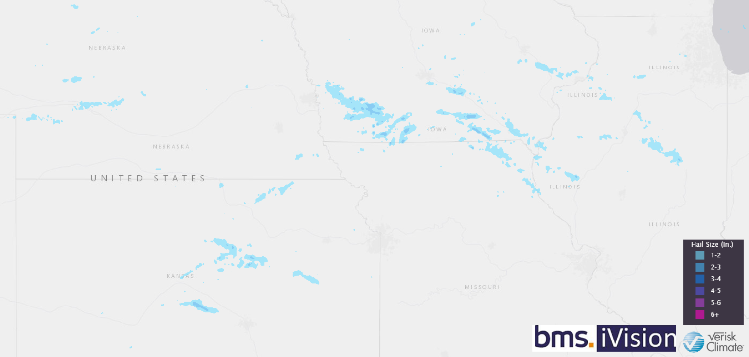 BMS iVision uses Verisk Respond Severe weather attributes to help insurance clients understand the impacts of hail and high winds from severe weather events. Above is Verisk Respond hail size swath showing the area likely impacted by large damaging hail.
