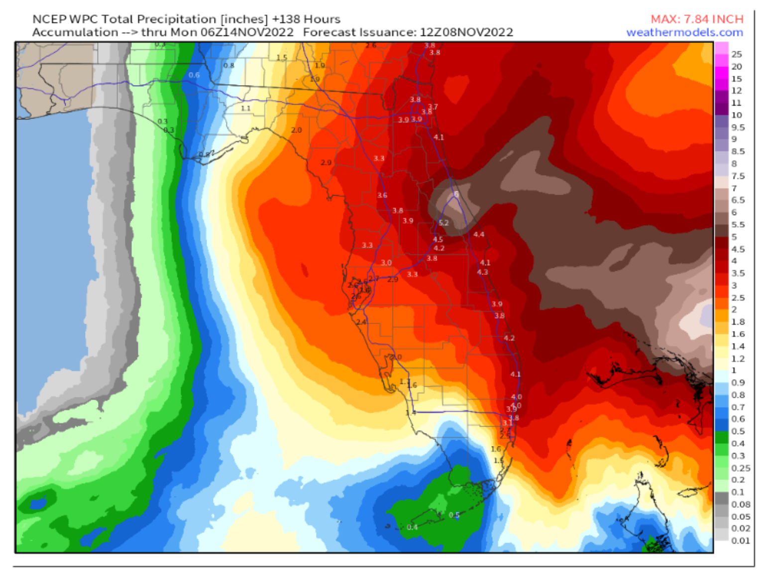 General rainfall totals of 2-5” are likely over much of the peninsula through Friday. The heaviest rain will bring flash flooding potential to South Florida and East Central Florida, where Ian’s precipitation impacts are lingering.