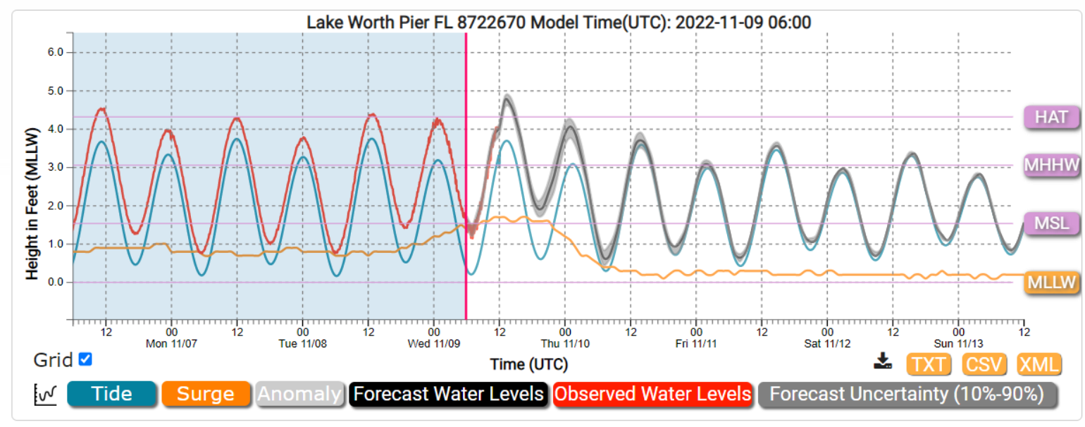 The plot above shows the mean low water level for Lake Worth Pier, FL, reaching a height of 5 feet. The NOAA Probabilistic Extra-Tropical Storm Surge product is a great resource for getting detailed storm surge impacts and how they relate to tide cycles.