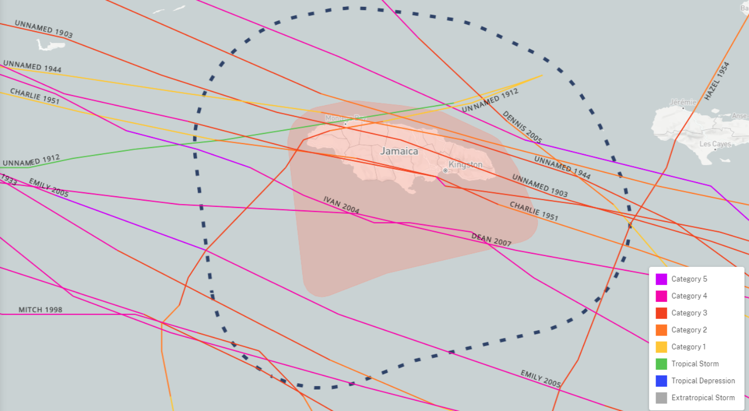 While a direct landfall on Jamaica is not the most likely scenario, it cannot be ruled out. The last major hurricane to make landfall on Jamaica was Hurricane Gilbert in 1988, as a Category 3 hurricane. Hurricane Beryl is projected to pass just south or over Jamaica later today, making it the most powerful hurricane to affect the island in 17 years (since Hurricane Dean in 2007). Here is a list of all Category 3+ hurricanes that have come within 50 miles of Jamaica.