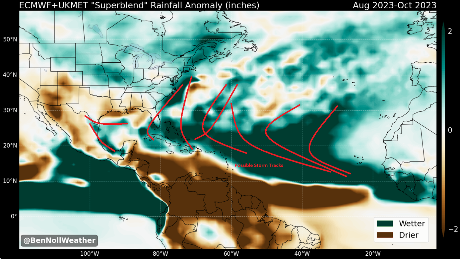 Where storms might track is of most interest to the insurance industry, we can use the rainfall anomaly to understand better areas that will see more rainfall, which in the months of August through October tend to be named storms. Also here is some other analogs based on Sea Surface temperature (SST) the insurance industry might want to check out.