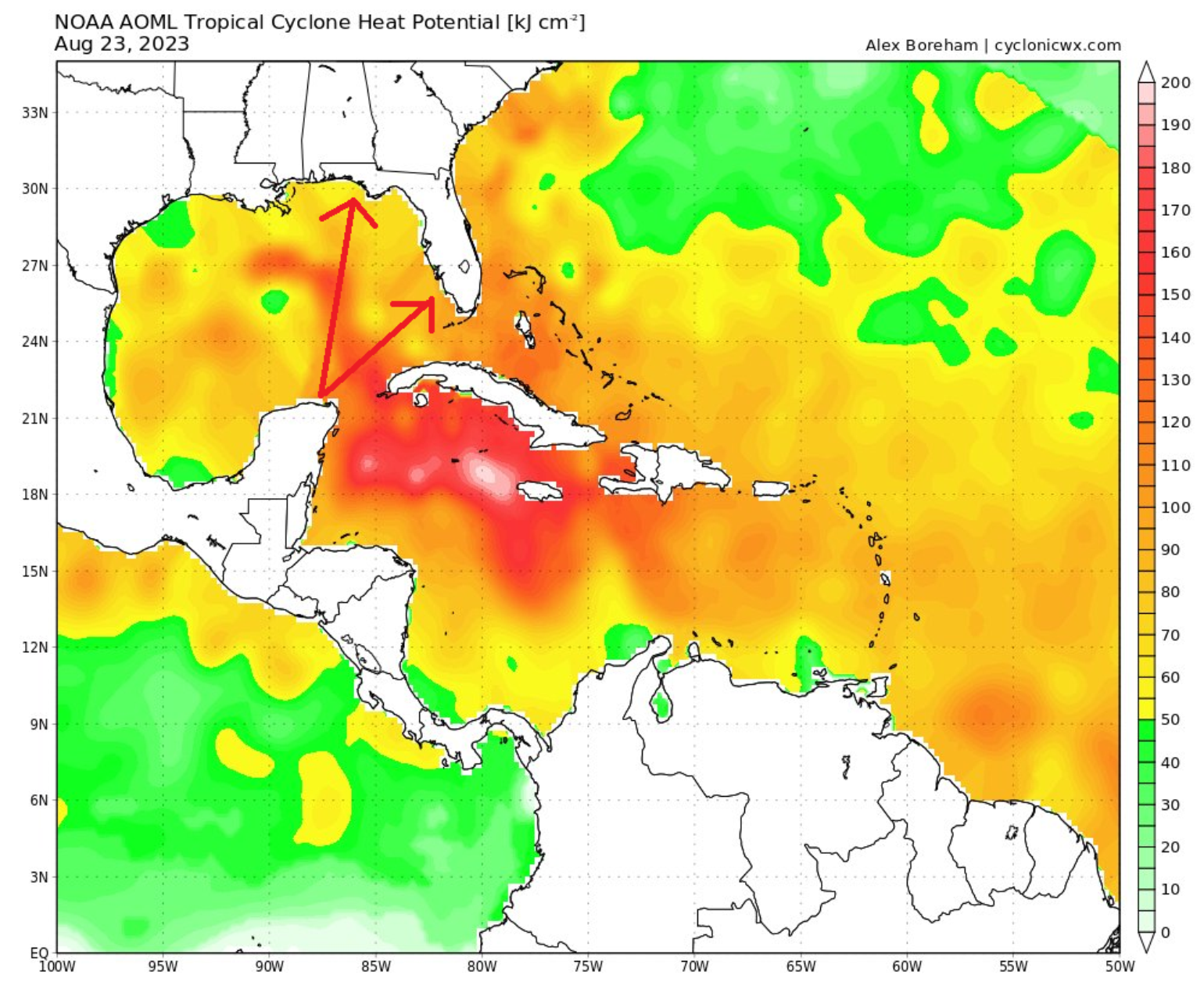 3) There are still some timing differences based on these two scenarios. The further west also gives it more time over a developing eddy current through the center of the Gulf of Mexico. A more north-south track would maximize Ocean Heat Content, while a track angle across the Gulf of Mexico (45–60-degree angle) would provide a weaker storm as it limits time over water and high ocean heat content.