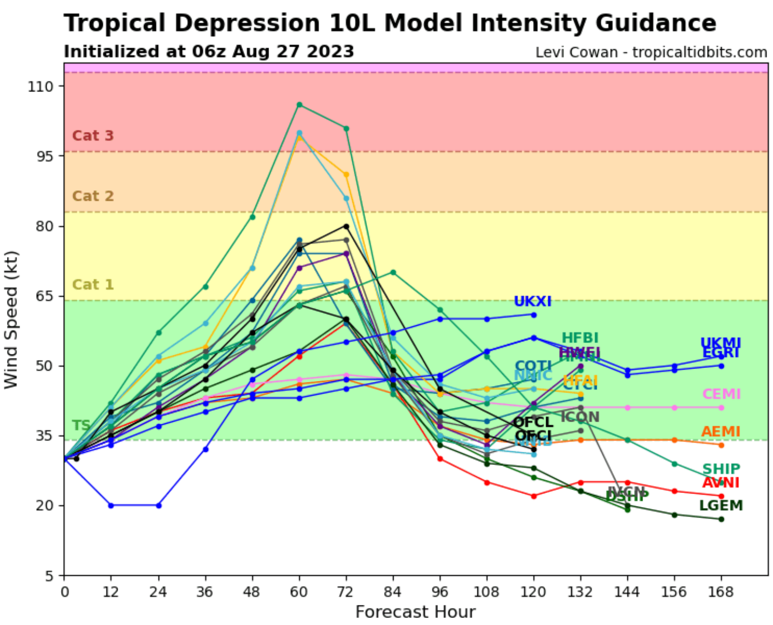 Above is the latest intensity guidance from this morning's various forecast models for intensity guidance. So that you know, some of the hurricane models are not part of this intensity guidance. (Source TropicalTidbits.com)
