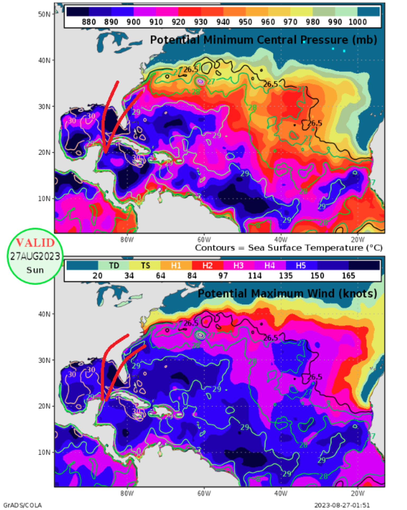 On Friday, the tropical update showed that this tropical system would be tracking over large areas of high Ocean Heat Content that considers not just the Sea Surface Temperatures but the depth of this warm water. In 1996, known hurricane scientist Kerry Emanuel developed Hurricane Potential Intensity Maps (shown above), which guide perfect conditions regarding the maximum potential intensity of a storm over given waters. The latest values suggest the sky is the limit for intensity as the storm tracks over some of the highest areas of potential intensity in the Atlantic Basin in the eastern Gulf of Mexico.
