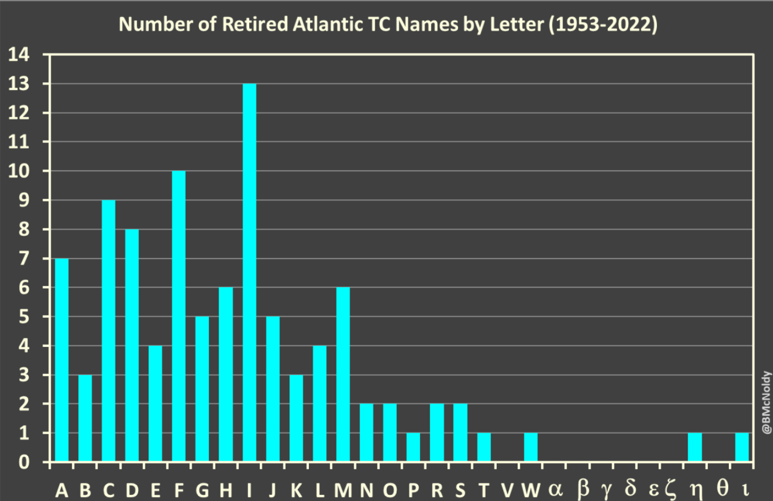 The number of retired Atlantic "I" tropical cyclone names is partially owing to seasonality - "I" storms currently tend to occur in late August and September when tropical cyclones are more likely to be more intense. This is also partially coincidental. For example, the number of retired "I" Atlantic names (13) is greater than the sum of retired "H" names (6) and "J" names (5), even though all these storms occur at about the same time in a given season. The letter with the second-most retired Atlantic hurricane names is "F," with 10. The third most is "C," with 9, and also strangely, there has been only one retired "C" name since 2001 (Charley, 2004). Also strange is that 11 of the 13 storms (85%) that prompted the retirement of an "I" name occurred in 2001 or later. Atlantic tropical cyclones were first named internally in 1947, and these names were publicly shared beginning in 1950.