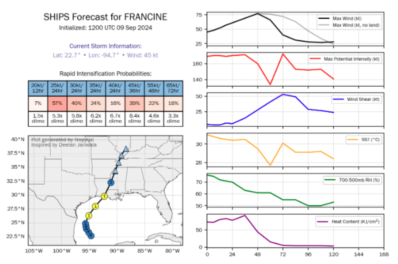 In general, it is still too early to discuss the details of impacts and insurance loss. We know that the main impact will be east of the circulation center; heavy rain will fall across Southeast Louisiana and parts of Mississippi, Alabama, and the Florida Panhandle. Storm surge could be a problem depending on how fast Francine rapidly intensifies towards the coastline and how large the overall wind field becomes, which is still a big question mark. Some models suggest rapid intensification is even possible. Some models are much more aggressive than others. A few brief, isolated tornadoes are possible east of the center Wednesday night and Thursday across parts of Southeast Louisiana, Mississippi, and Alabama.
