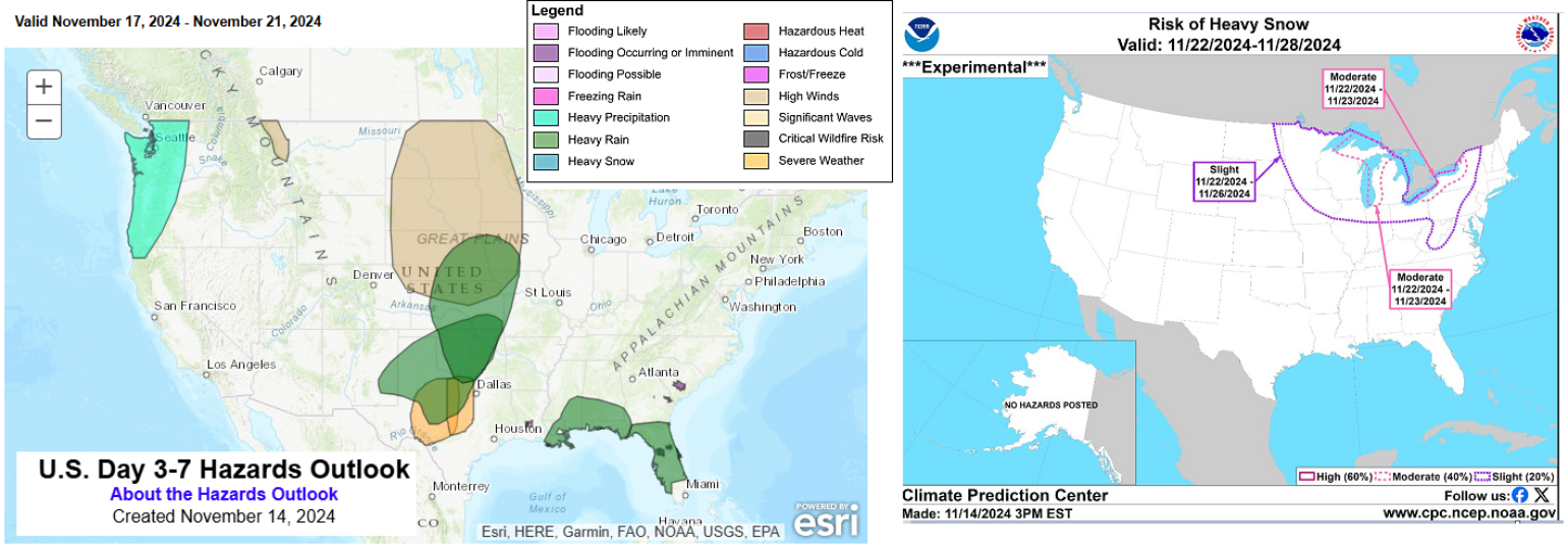 Next Monday and Tuesday, the Gulf of Mexico will be influenced by a powerful trough of low pressure in the central U.S., providing a cold front across the region. Sara is expected to merge with a cold front, intensifying mid-week thunderstorm activity associated with the front. Currently, the primary impacts in Florida are anticipated to be severe weather late Tuesday in the Panhandle, with storms advancing across the Florida peninsula on Wednesday and affecting other parts of the Southeastern U.S. The severe thunderstorms provide a risk of gusty winds along the convective line. Rainfall totals in the Panhandle could reach 1 inch or more, while amounts for the peninsula will likely be a little lower, posing no significant risk of insurance losses. On a positive note, parts of the Southeast and Northeast may see their heaviest rain in months, offering some relief as fire concerns grow in areas of the Mid-Atlantic and Northeast U.S. Below are some graphics to outline general guidance of possible hazards given the large scale upper trough that will impact much of the U.S. over the next week.