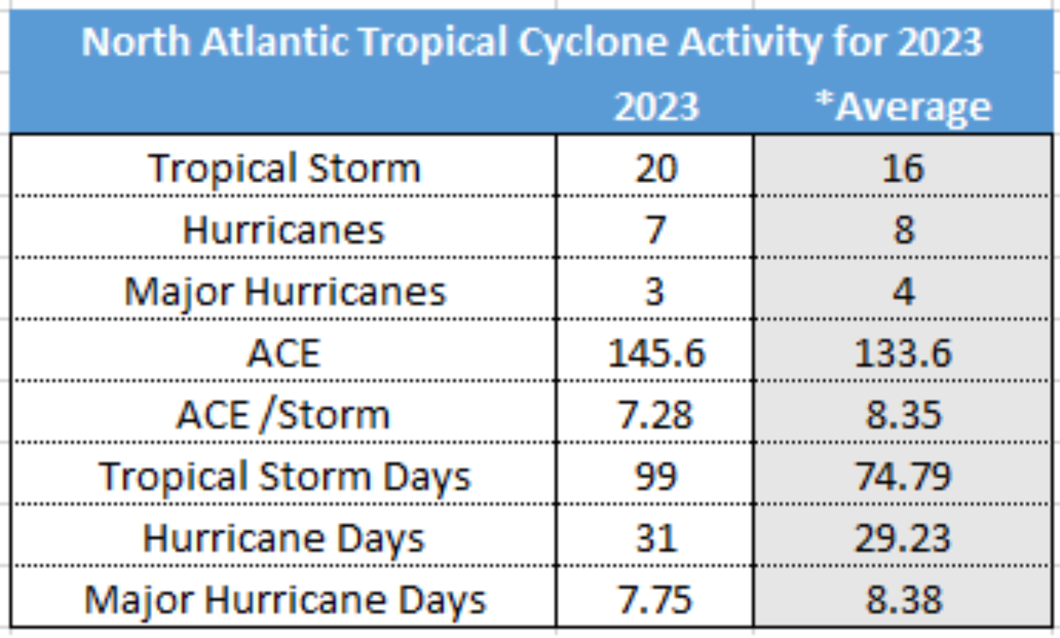 Ultimately, the overall Atlantic Basin is summed up by quantity over quality. Below are the seasonal numbers. The season has produced an above-average number of tropical storms and ACE. With many of the other observations at the 1995-2022 average or just below the average for hurricane and major hurricane development. Moreover, the ACE per individual storm is below the average, as shown in the table below. Blending all these seasonal metrics equates to “a near-normal season.”