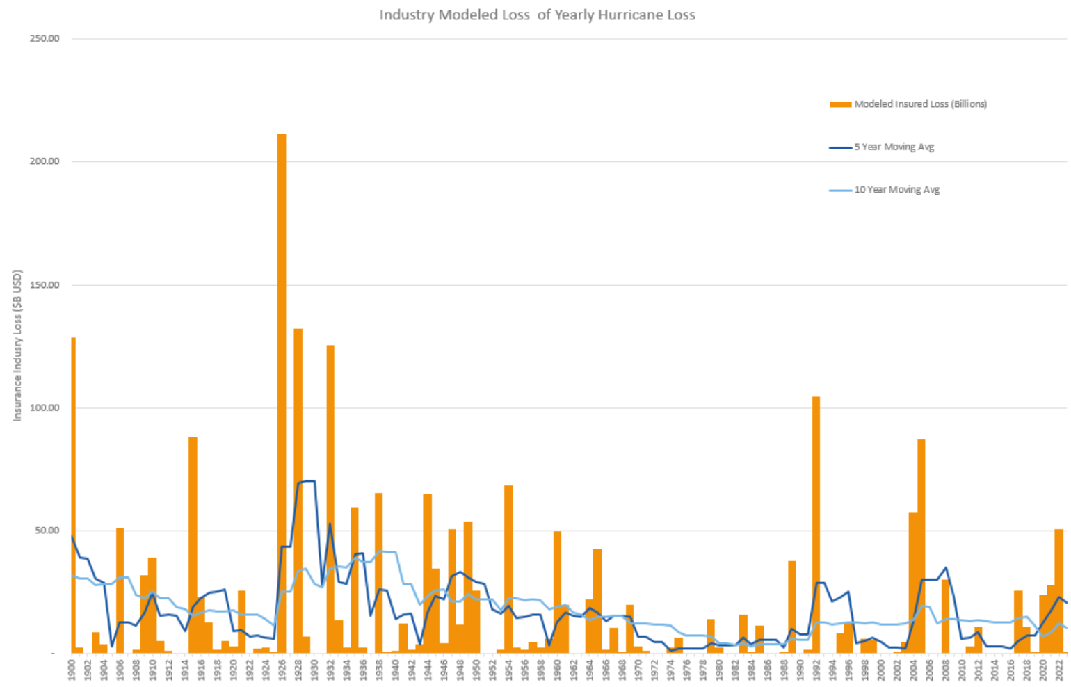 As this post has highlighted, the losses were well below the average industry loss since 2017 of $36B, which shows more considerable yearly losses since 2017. The long-term 10-year moving average loss continues to trend closer to $10B in loss, with the long-term yearly average loss from the model being close to $16B.