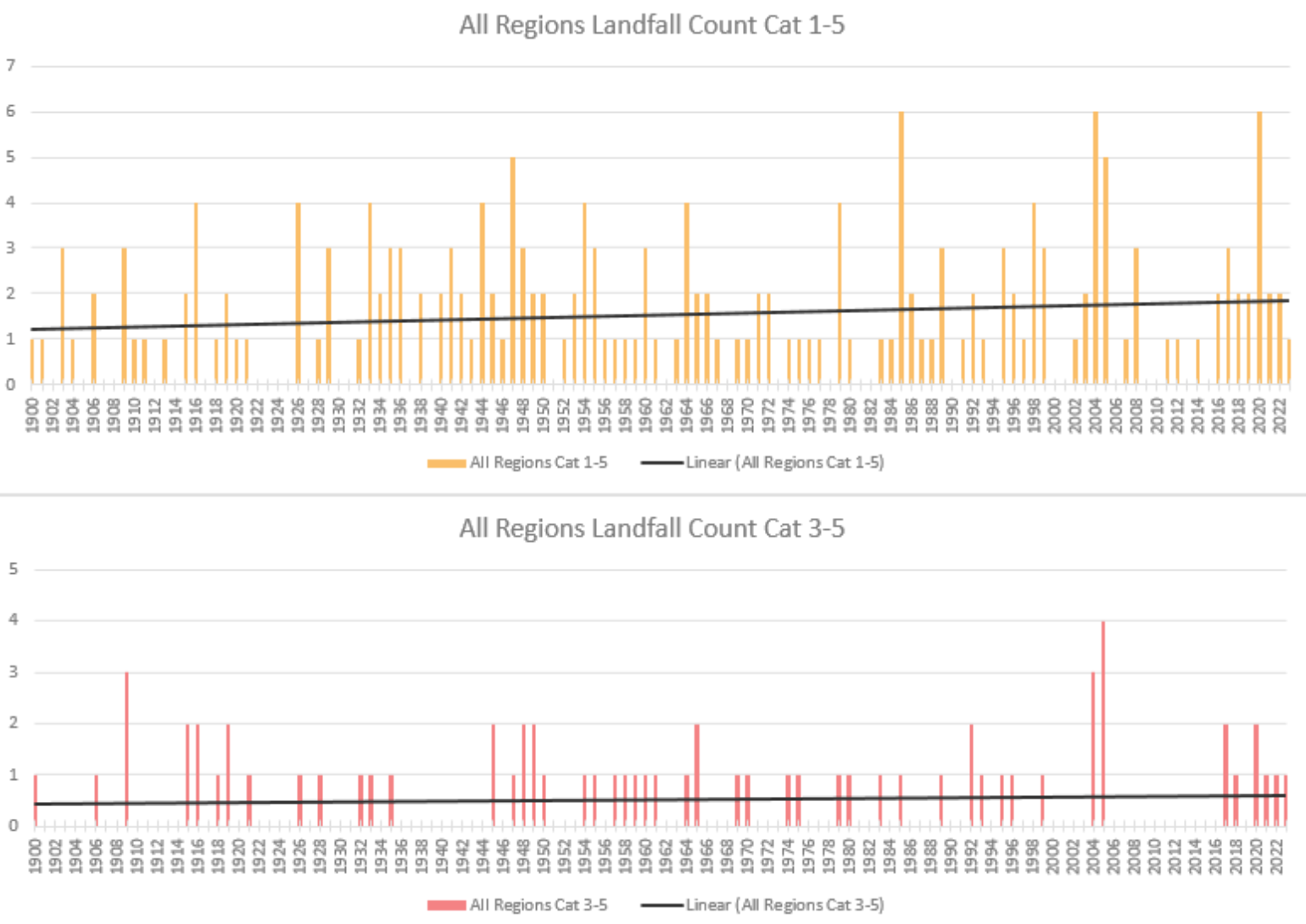 We know the 2023 season will not change the overall trend in landfalls of hurricanes or losses. With an expected landfall rate of 1.6 to 1.8 (depending on the source) hurricanes per year, the 2023 season is nothing unusual. Still, landfall continues to rebound from the historically quiet years between 2006 and 2016.